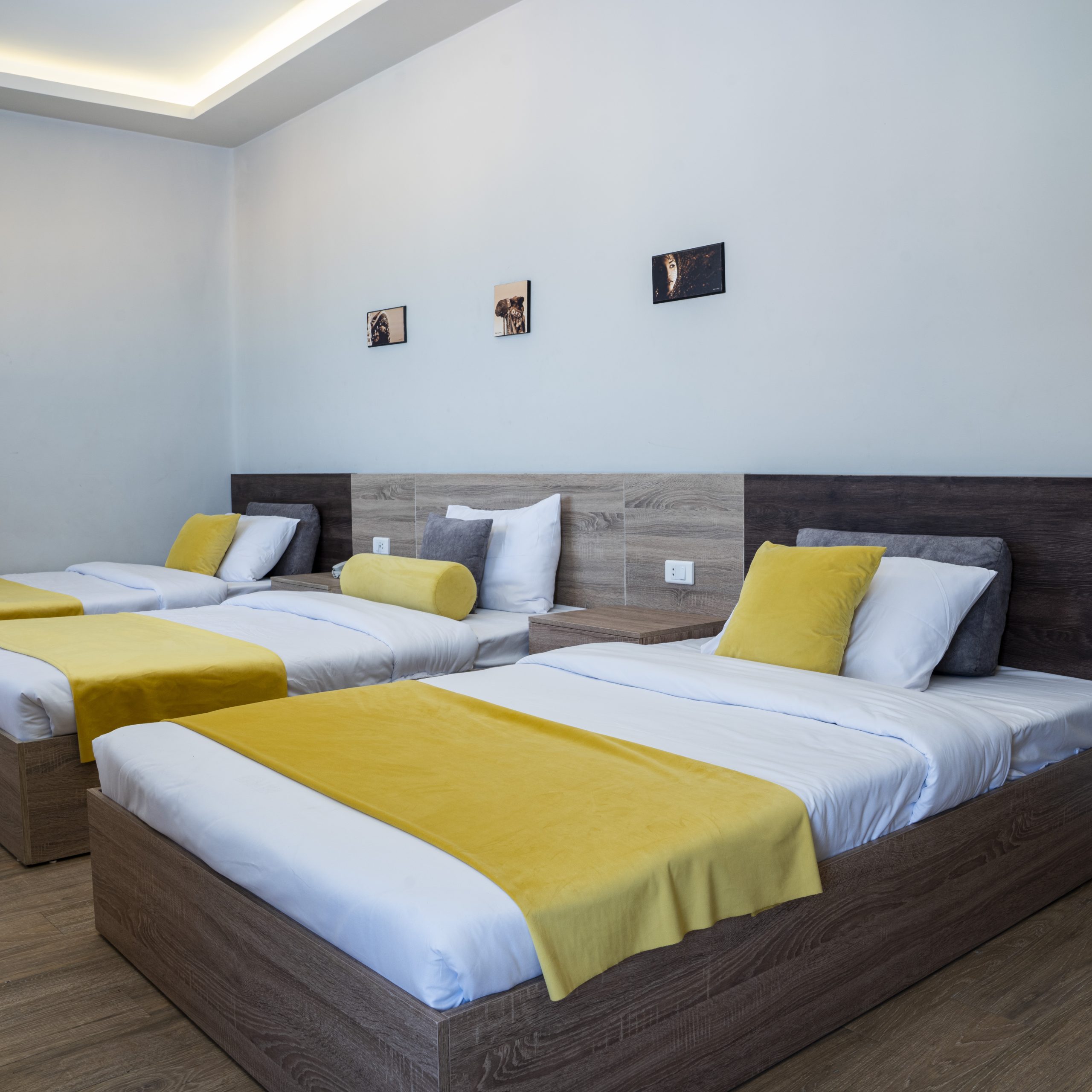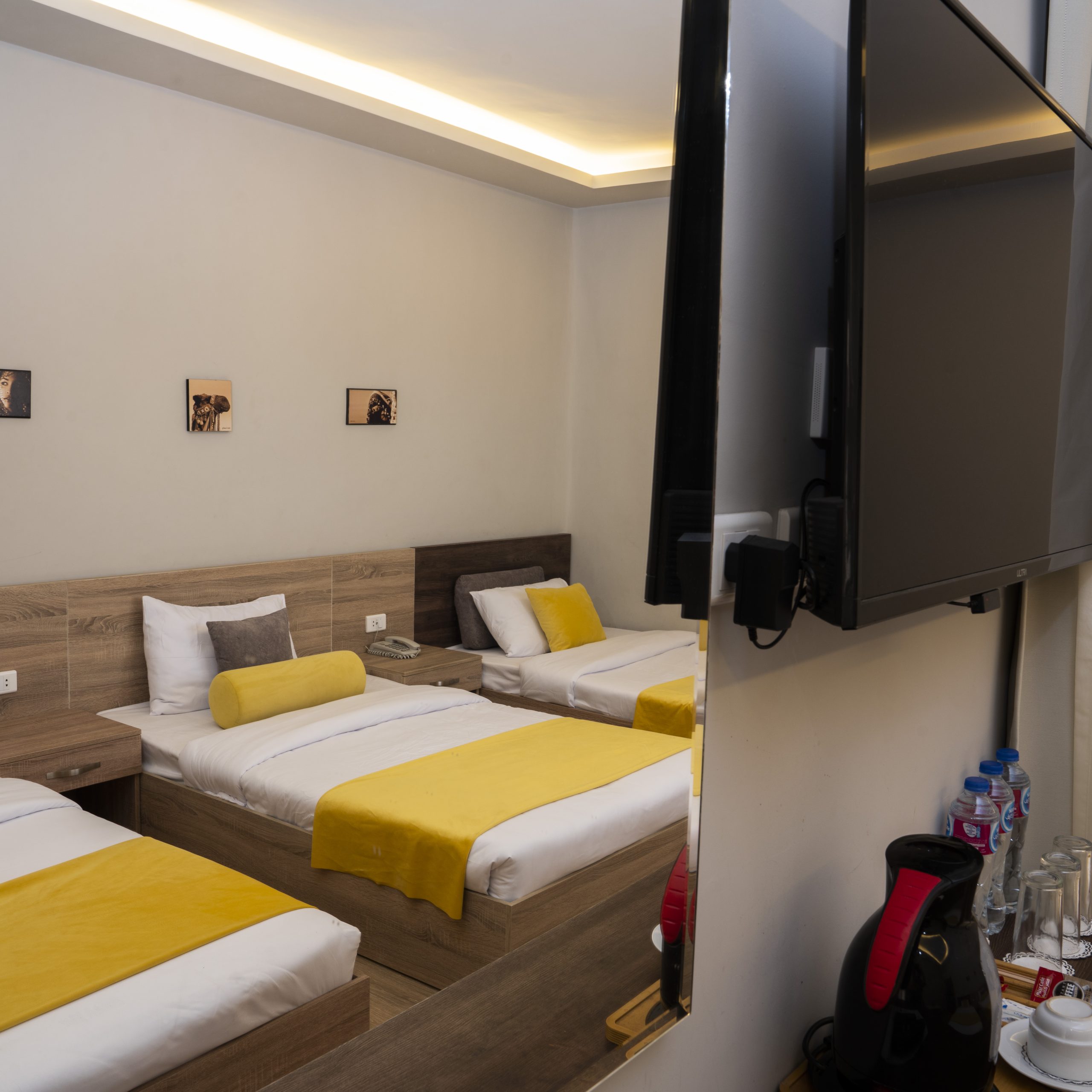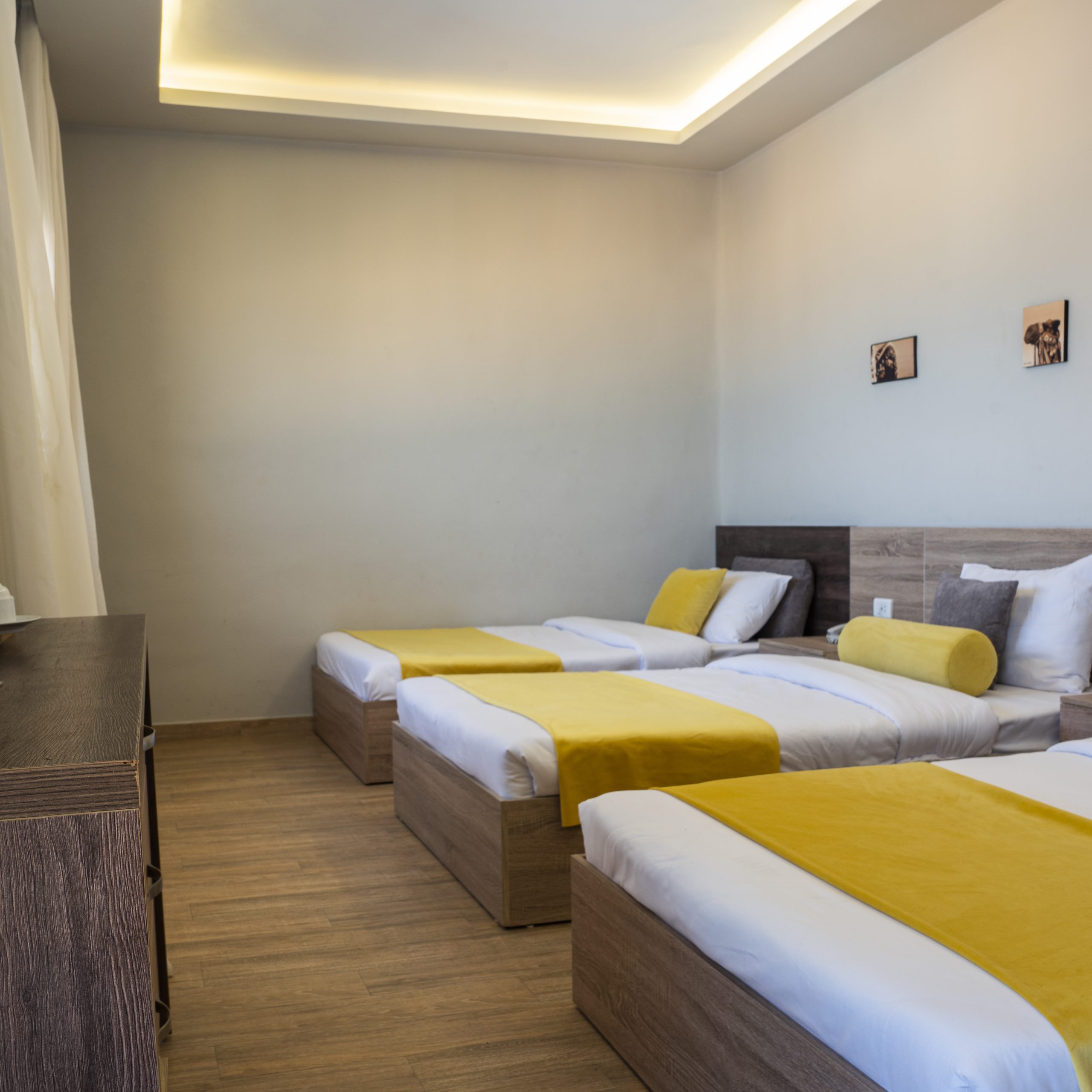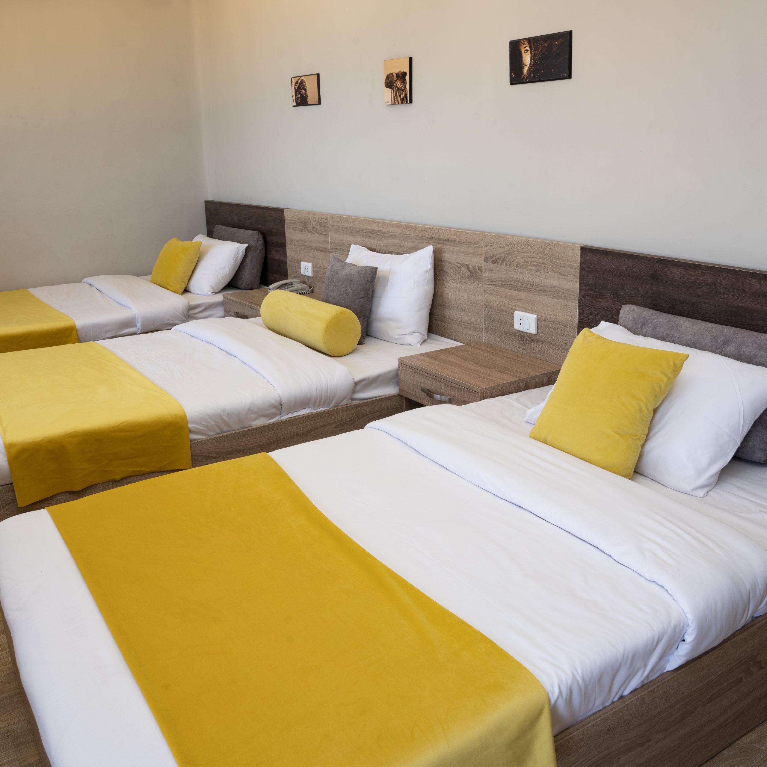 Standard Room comprises of 3 Twin Beds, 2 Bedside Tables, a Desk & Chair. The room is furnished with trendy furnishings.