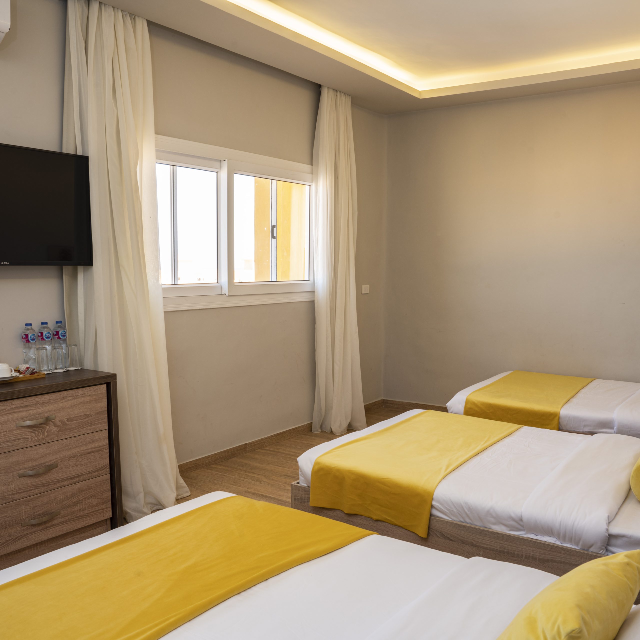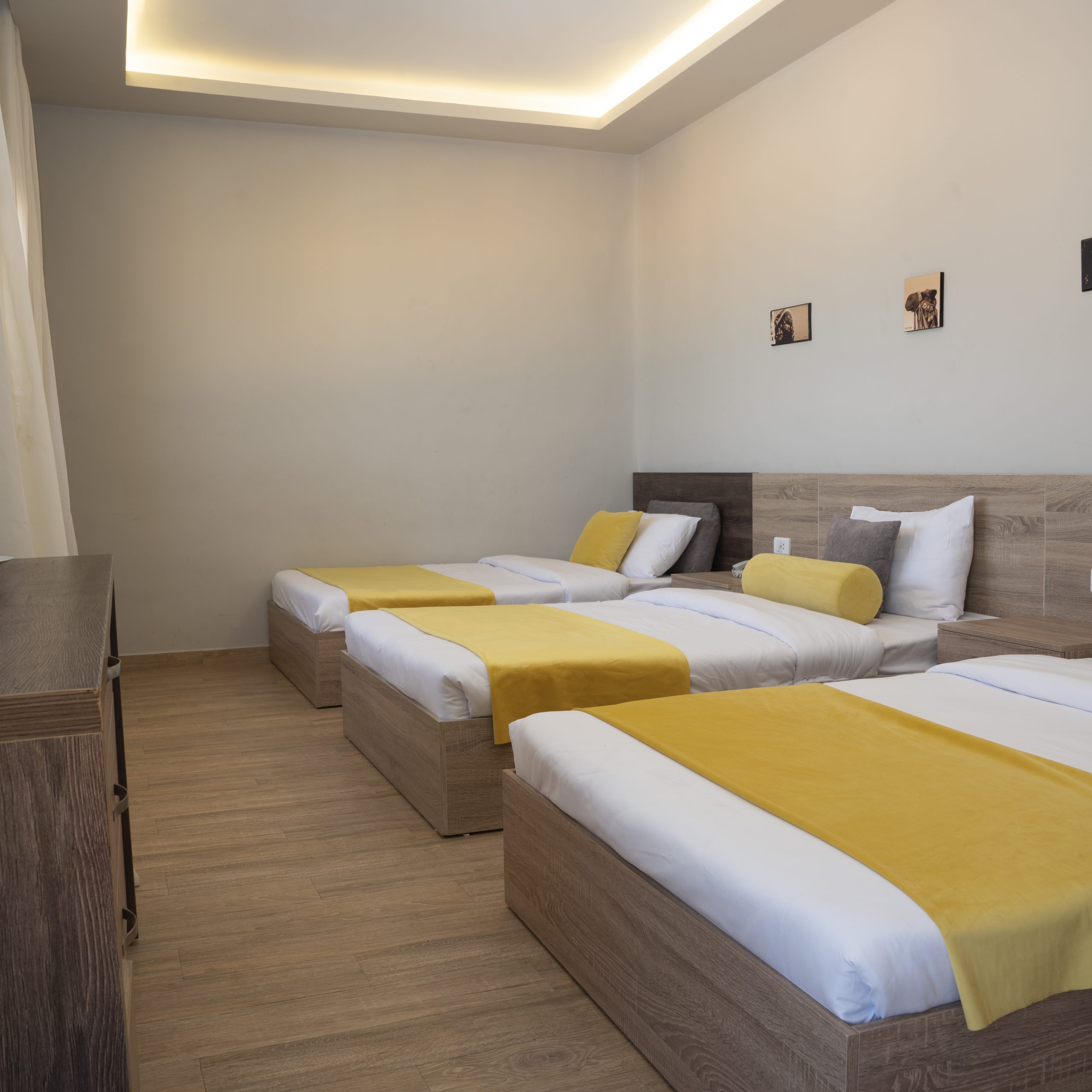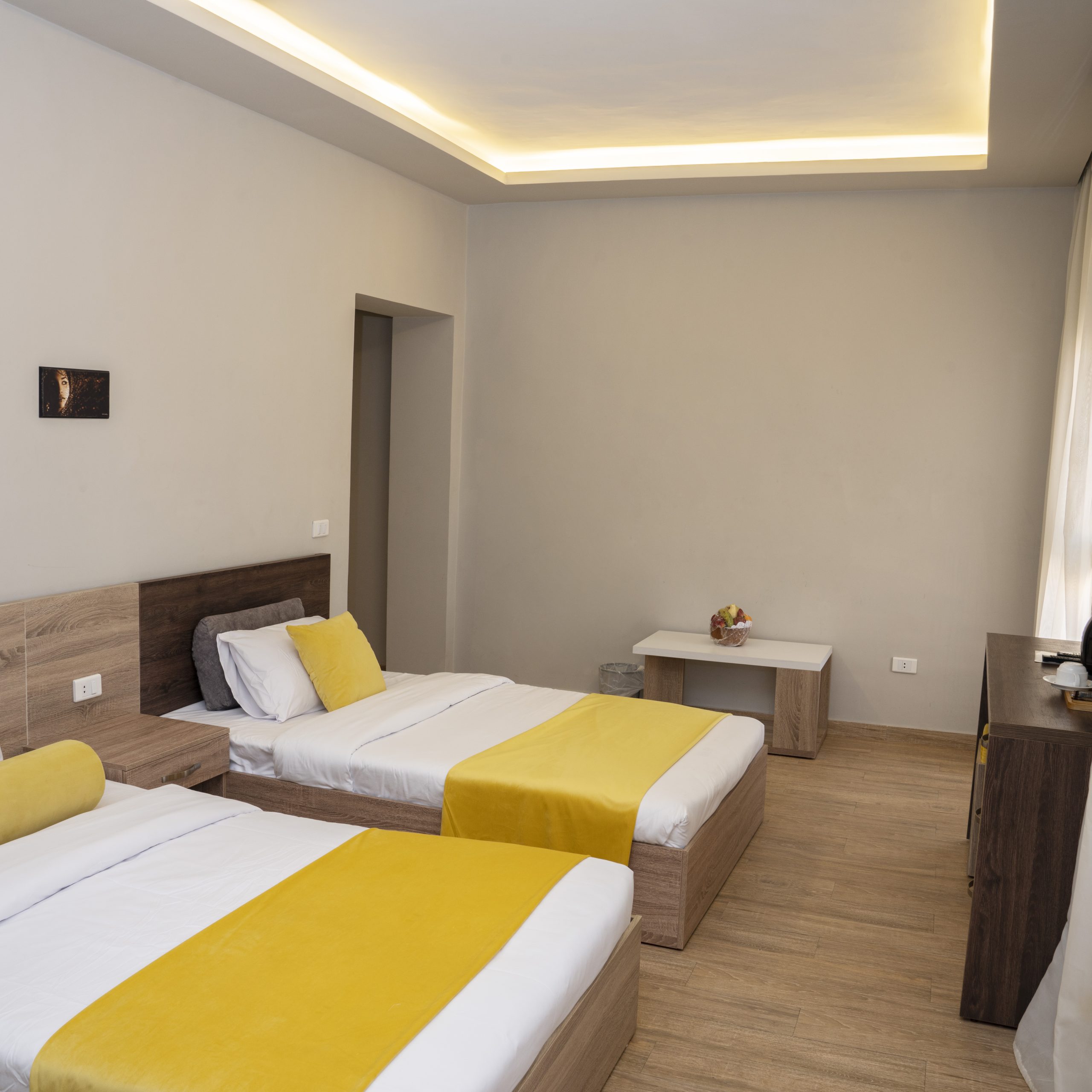 Standard Room comprises of 3 Twin Beds, 2 Bedside Tables, a Desk & Chair. The room is furnished with trendy furnishings.