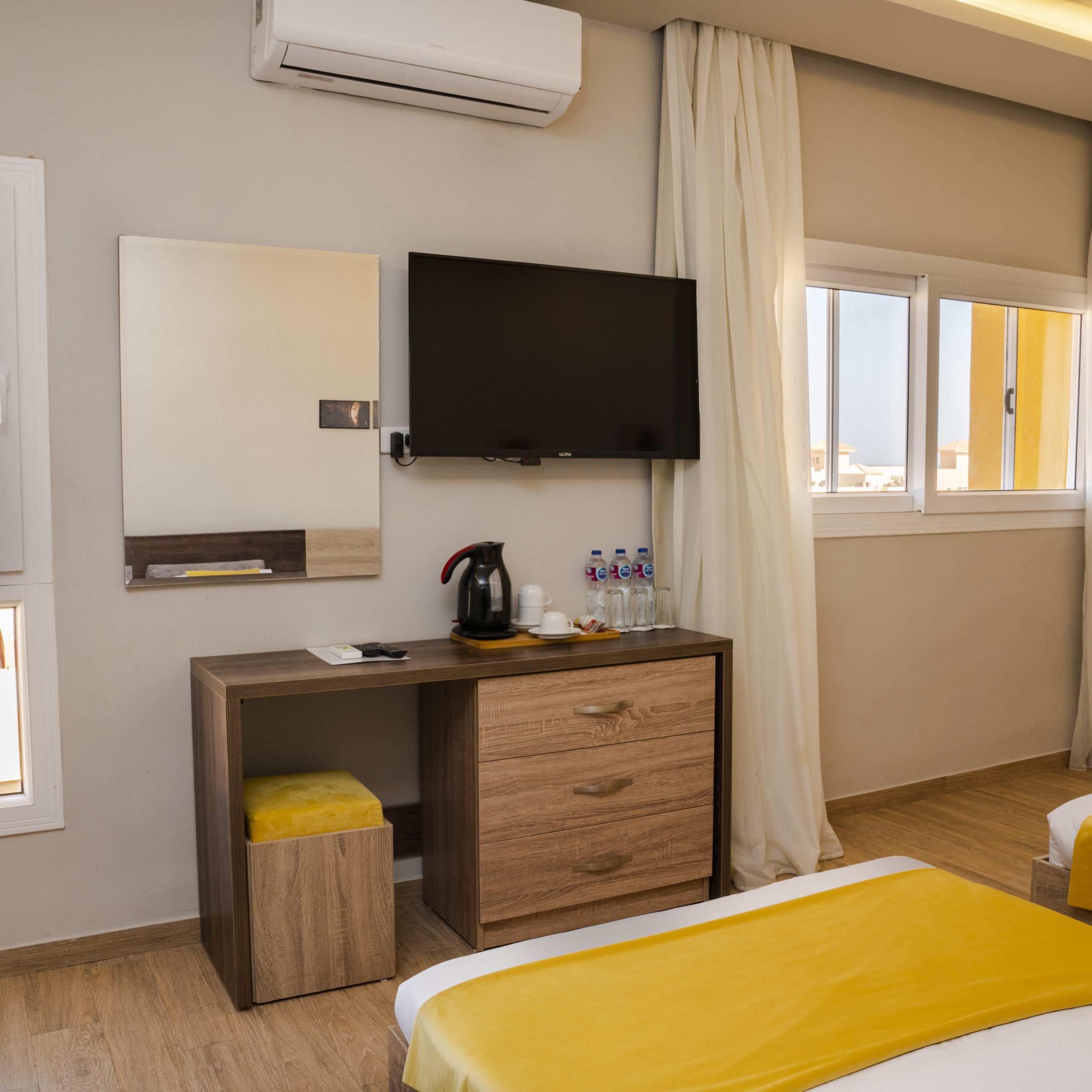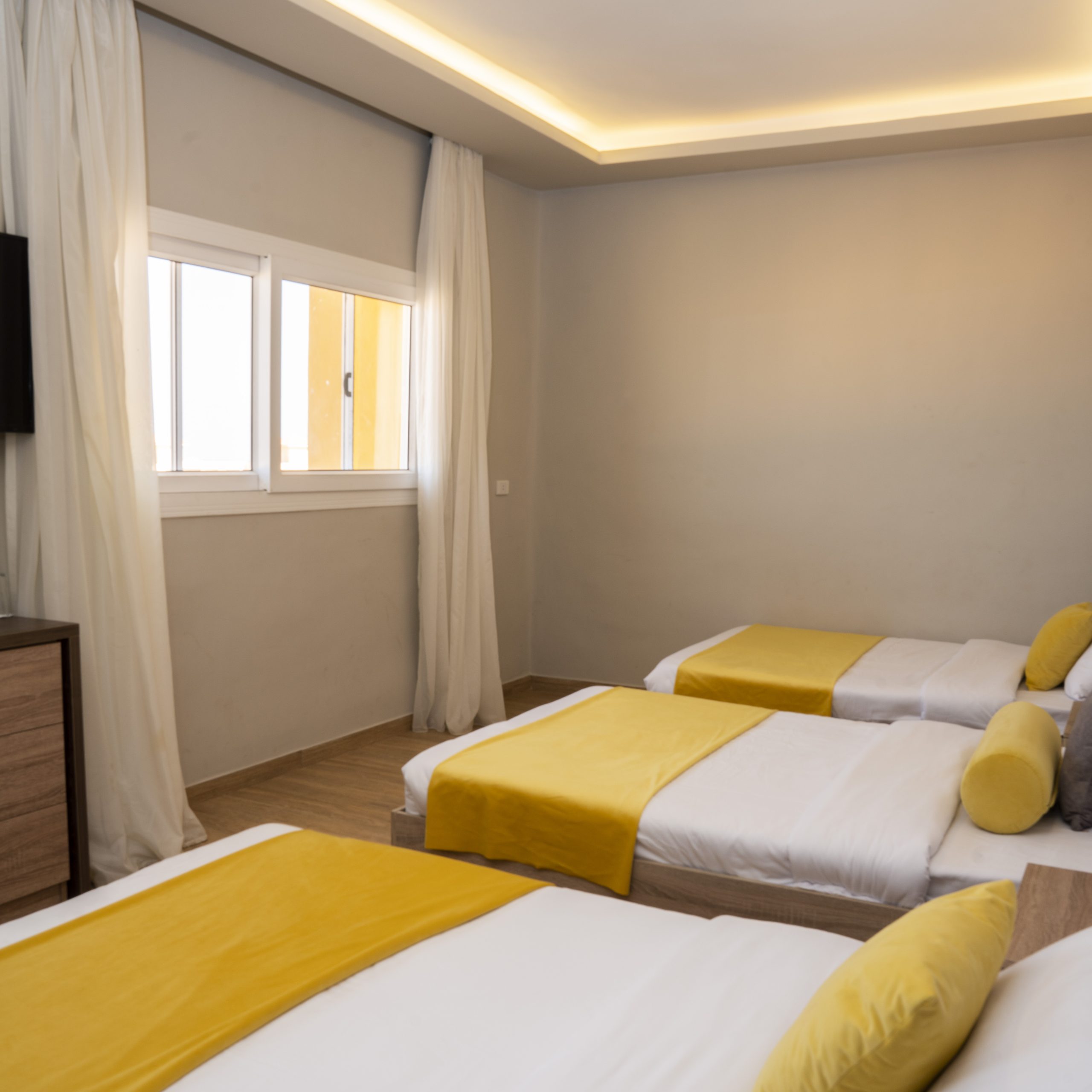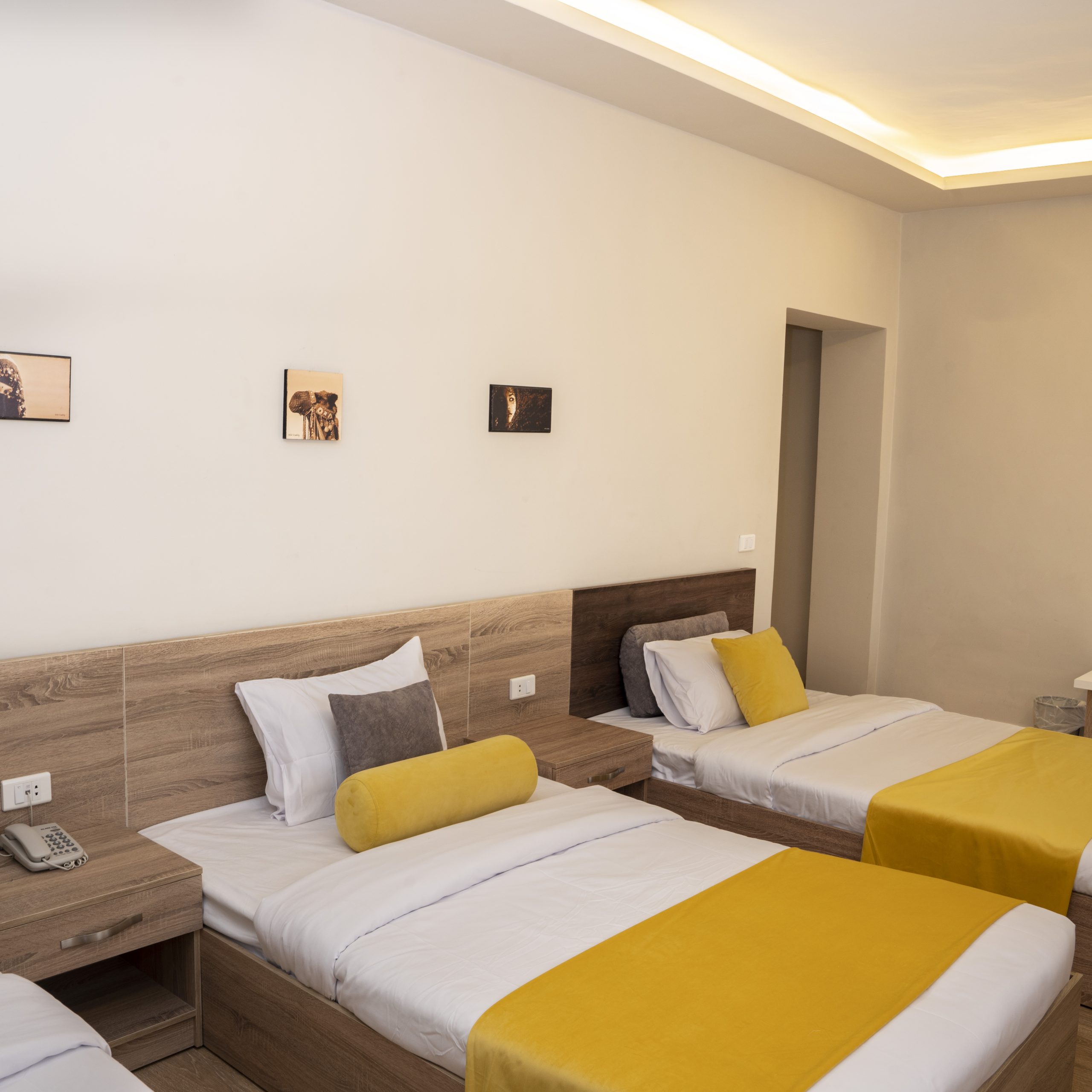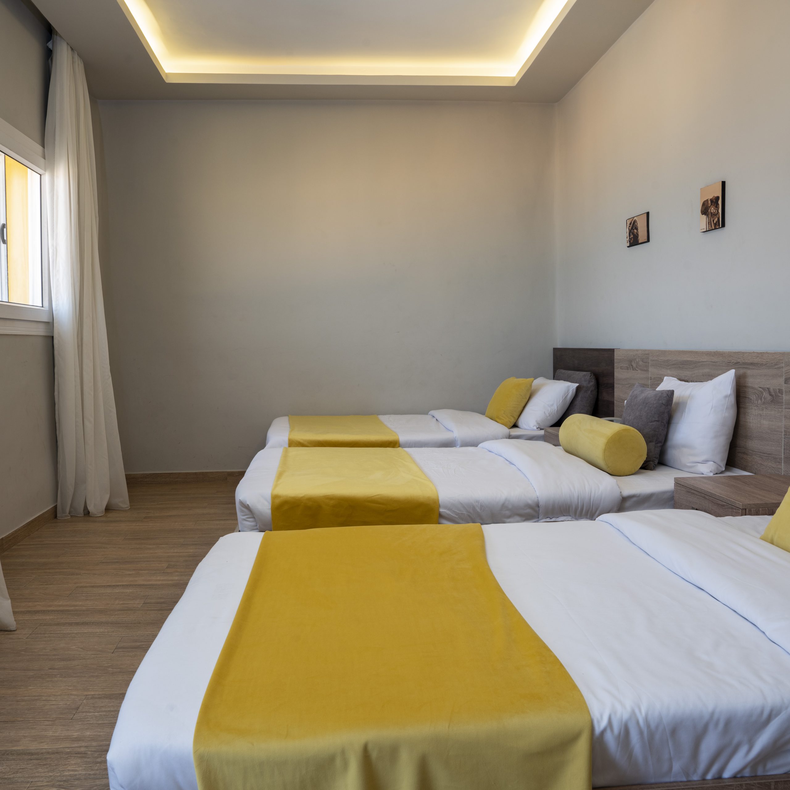 Standard Room comprises of 3 Twin Beds, 2 Bedside Tables, a Desk & Chair. The room is furnished with trendy furnishings.